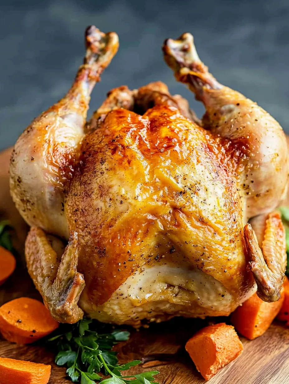 - Brush the exterior with melted butter applying evenly across all surfaces. This creates the golden mahogany color everyone associates with a perfectly roasted chicken. Truss the legs with kitchen twine and tuck wings underneath which prevents extremities from drying out and promotes even cooking.