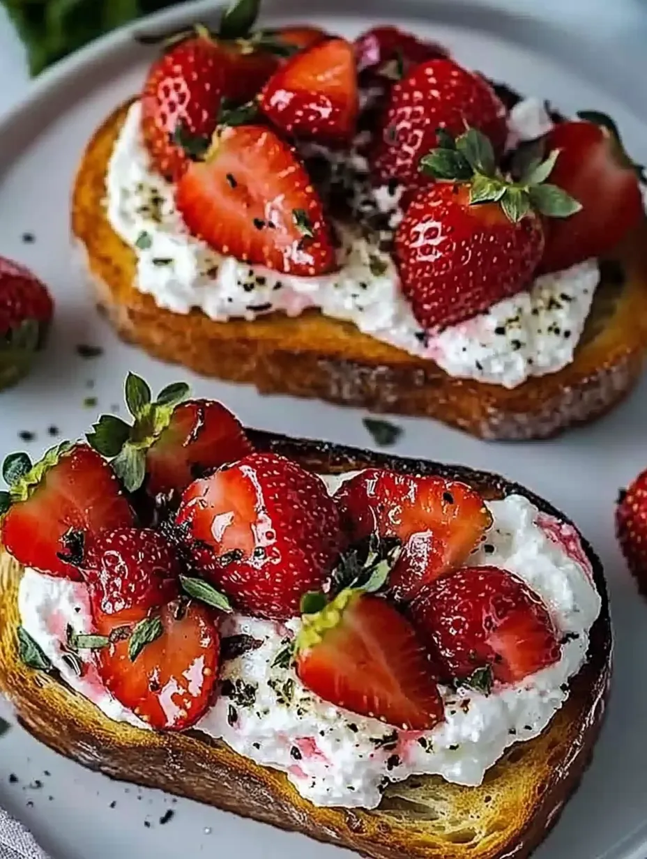 - Spread a generous layer of whipped ricotta across each slice of toast, creating small peaks and valleys to capture the strawberry juices. Spoon the roasted strawberries over the ricotta, including some of their syrupy juices. Finish with a light drizzle of honey and scatter fresh herbs if using. Serve immediately while toast is still warm.
