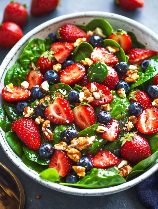 - In a large bowl gently combine the baby spinach strawberry slices and blueberries. The key is handling the berries delicately to maintain their integrity while ensuring even distribution throughout the greens. This creates the fresh foundation of the salad.